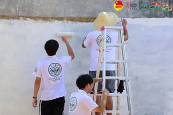 知行社会实践队队员们在粉刷墙面