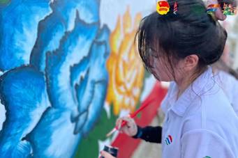 墙面清洁完毕后,队员们开始对墙面进行粉刷。在粉刷过程中,墙面的凹凸不平给团队的工作带来了极大的挑战。在余伊彤老师的指导下,队员们重新改进了粉刷的方法,顺利完成了墙面的粉刷工作,为后续墙绘工作打下了良好的基础。