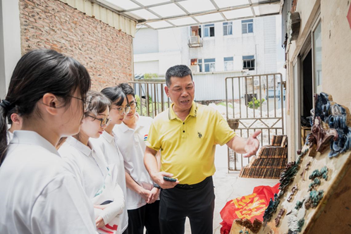 古建筑陶塑瓦脊制作技艺第四代传承人何大智向队员介绍陶塑作品