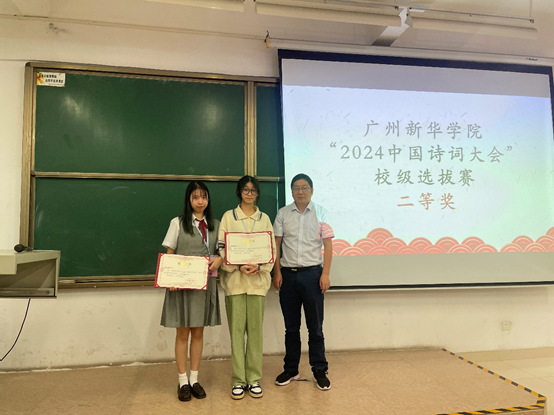 经过激烈角逐,比赛评选出一等奖2名,二等奖2名,三等奖4名。健康学院的吴凡熙、中国语言文学系的戴惠钰在比赛中脱颖而出,将代表学校参加“2024中国诗词大会”广东省选拔赛。