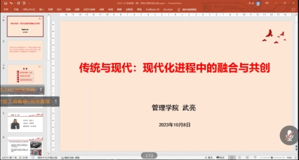 10月8日,武亮以“传统与现代:现代化进程中的融合与共创”为主题,通过线上授课的形式为管理学院各支部学生及教师讲授“思政第一课”。他围绕“现代化的辩证视角双刃剑”“现代化是一个历史范畴”“传统在现代化中的作用正确处理传统与现代的关系”进行讲解。他提出,在推进中国式现代化进程中,正确处理传统与现代的关系,必须充分发掘中华优秀传统文化在凝聚精神动力、维系情感纽带、增进人格教化、推动人与自然和谐共生等方面的重要作用,不断赋予中国式现代化以深厚的中华文明底蕴。