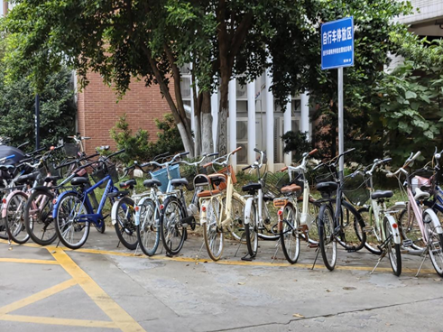 本次活动的志愿服务区域主要集中在东莞校区诚意园食堂附近的停车点,志愿者将校园内散落的自行车移至停车区域并在现场指引师生依规有序停车。