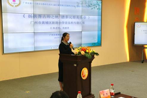 广州市黄埔区新港小学德育处副主任、音乐科组长张丽茜老师以《扬扶胥古埠之帆 谱多元育美乐章》为题,从音乐教学成果、艺术社团建设、美育特色活动以及教师的个人成长等方面,对音乐科组和学校美育工作进行了介绍。