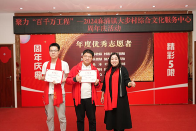 法学院学生郑文豪、吴泽因在大步村积极参与各类志愿服务活动,贡献突出,获评由东莞市麻涌镇大步村新时代文明实践站、东莞市麻涌镇大步村综合文化服务中心、东莞市麻涌大步村志愿服务站联合颁发的“年度优秀志愿者”荣誉称号,并作为代表上台领奖,由麻涌镇团委副书记、麻涌志愿者协会会长陈晓敏为他们颁发荣誉证书。