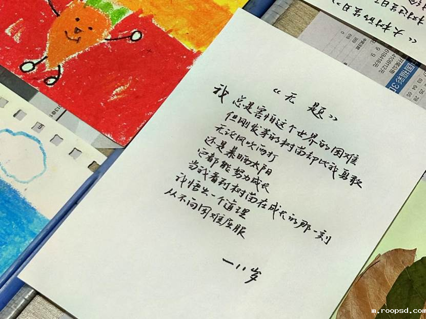 一幅幅色彩斑斓的画作,一件件精巧细腻的手工艺品,不仅展示了乡村孩子们的艺术天赋,更是他们心灵世界的真实写照。这些作品不仅记录了孩子们的成长历程,也反映了他们在美育引导下情感和审美的不断提升。除了丰富多彩的作品展示外,本次美育作品展尤为引人注目的亮点在于“儿童诗歌”的创意呈现,孩子们用稚嫩却真挚的笔触,抒发着对世界的好奇、对美好的向往,那些纯真的诗句中饱含着对生活的热爱和对未来的憧憬。