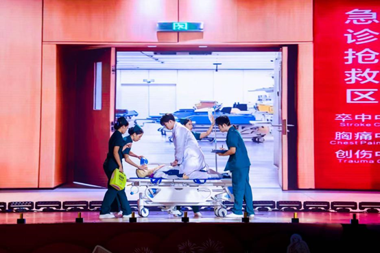 聚光灯下的每一幕,都是护理日常的鲜活缩影:常规病房组推着轮椅俯身倾听,“三查八对”的动作里,是刻进骨子里的严谨与温柔;儿科护士手偶轻摇,甜笑里裹着对患儿的柔软守护;妇产科护士怀抱“新生”的姿态,把生命起点的希望揉得滚烫;急诊科推着抢救车奔来,跪地心肺复苏的干脆利落,是与时间赛跑的果敢;手术室传递器械的默契配合,让“无影灯下的第三只手”有了具象的温暖。6组科室的演绎,把“专业”拆成了看得见的动作,把“温柔”变成了摸得到的温度。