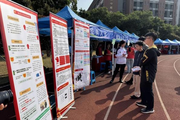 在东莞校区举办的2026届毕业生校园招聘会上,特别设立征兵宣传与政策咨询专区,将入伍政策精准送达每一位求职学子身边。