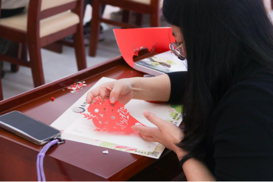 活动现场暖意融融,氛围热烈,女教职工们迅速投入创作,乐在其中。一张张红纸在她们的指尖蜕变为寓意美好的剪纸佳作,既承载着大家的欢喜,也展现出