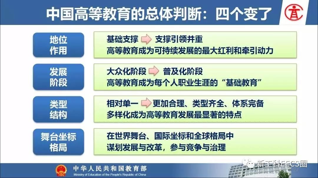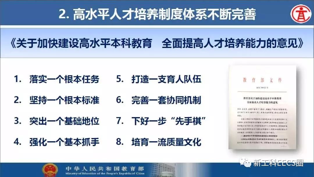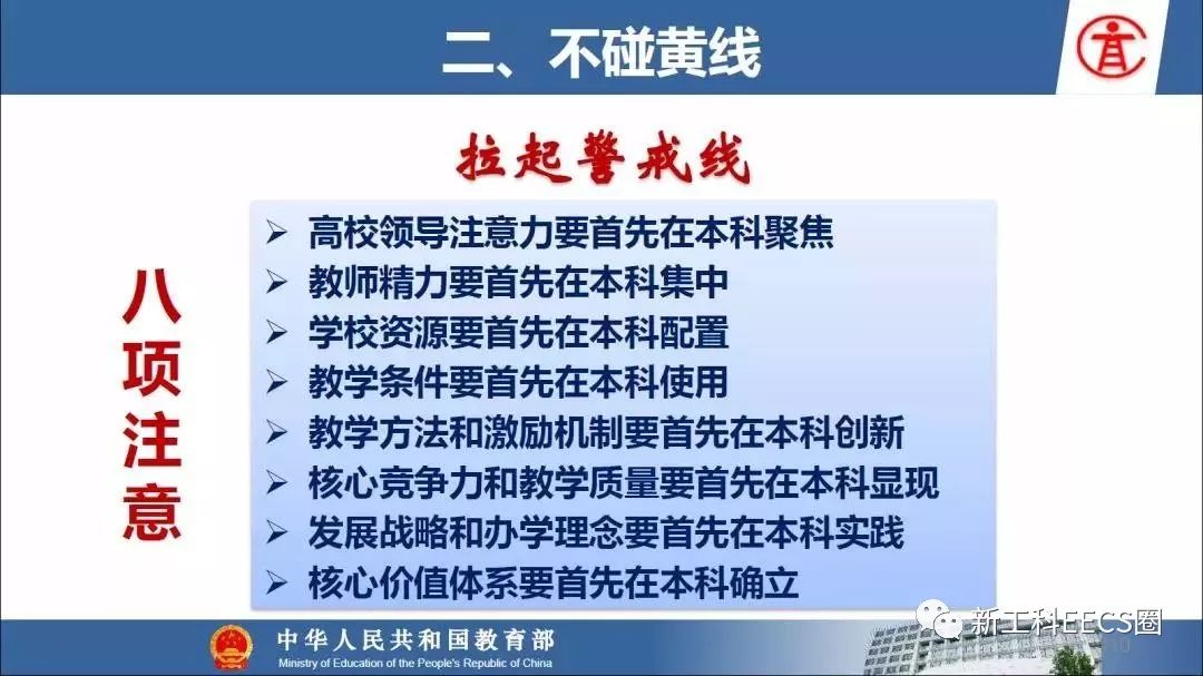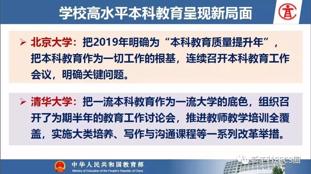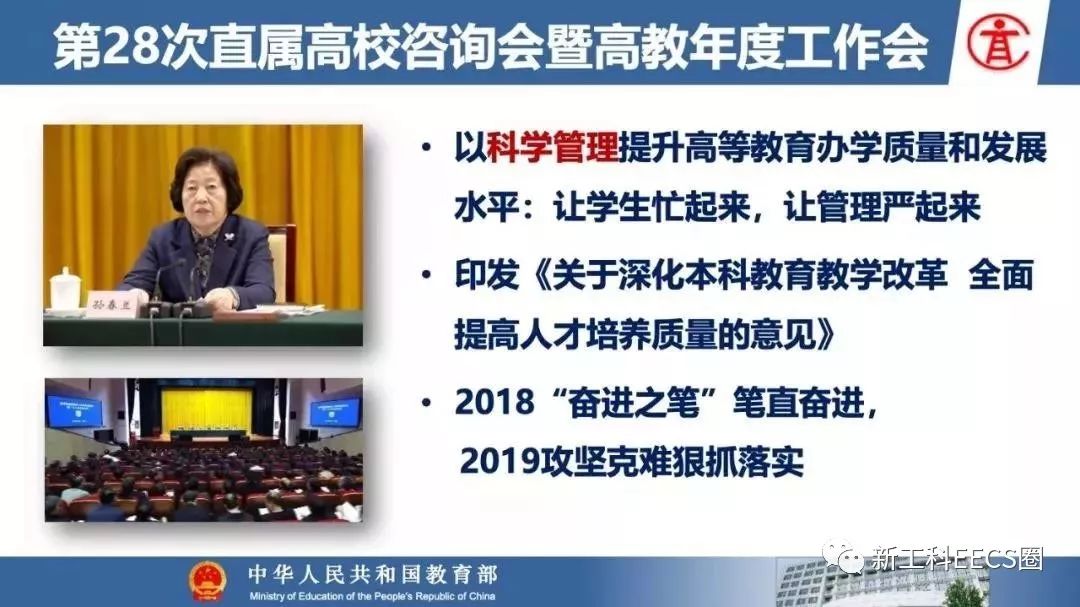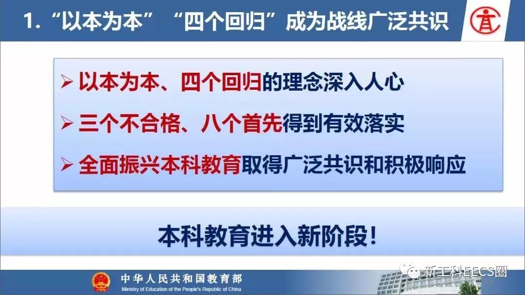 报告指出:要精准把握高等教育发展大势,超前识变、积极应变、主动求变;提到本科教育呈现新局面,“以本为本,四个回归”理念深入人心,“三个不合格、四个首先”得到有效落实;最后强调要通过一系列行动,把本科教育质量实实在在提起来,学校要狠抓教学改革,让金专、金课、金师随处可见!