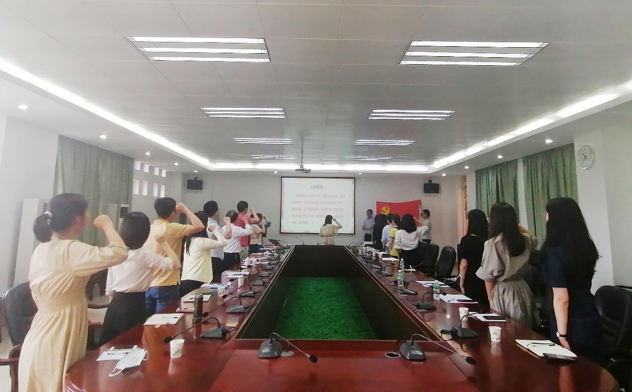 会议首先进行第一议题学习,支部成员观看学习视频“一百堂党史课——永不叛党”。视频讲述了入党誓词的演变,视频学习结束后,学生处全体党员面对党旗向党做出庄严承诺。