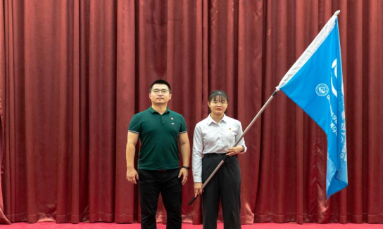 校团委书记代亮(左)授予青马班学员旗帜