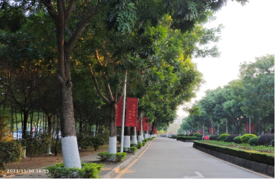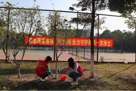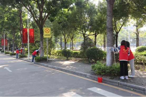 在党员同志和志愿者们的共同努力下,校道两旁的树木都换上了冬季专属“新衣”,为冬日