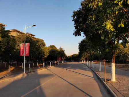 校道边,秋日的斜阳正不紧不慢地挥洒着丝丝余晖,撒在了正在工作的老师、同学们的发梢上,撒在了一棵棵大树、小树的“新衣”上,为这个冬天带来几分温情,为整个