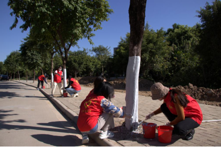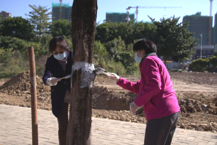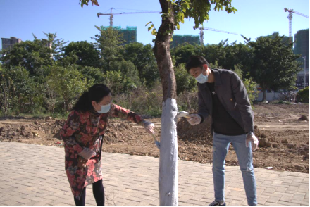 大家纷纷挽起袖子,一手提着涂料小桶,一手拿起刷子,弯着腰,有条不紊地刷着石灰。石灰溅到了衣服上,大家也丝毫不在意,反而把它当作勋章,更加热情地工作。大家热情高涨、干劲十足,在指定区域齐心协力、互帮互助,认真细致地对区域内所有树木进行规范粉刷。每一把刷子,都承载对树的诺言,每一颗心,都在默默温暖寒冬。大家一边工作一边讨论“为树添衣”的重要意义,一起期待着来年小树能茁壮成长,盼望老树能抽出新芽。