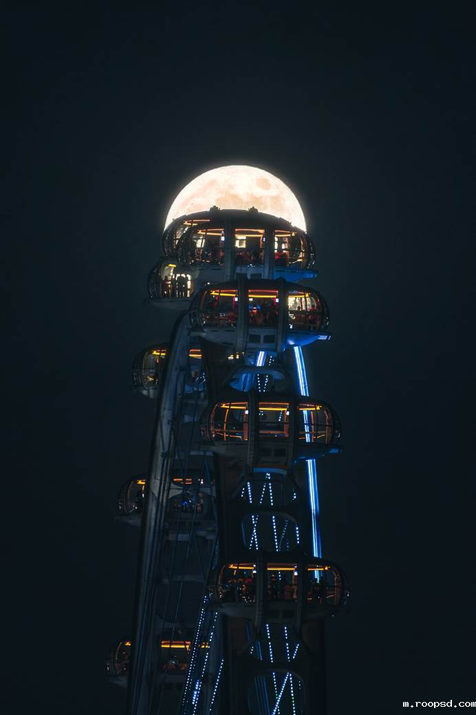 事件内容:一轮皎洁的明月静静地悬挂在如墨的夜空中,洒下银白的光辉,那巨大的摩天轮静静地矗立在湖水中央,在明月的映照下,闪烁着神秘而柔和的光芒。摩天轮的轿厢里,一家人紧紧依偎在一起。孩子们趴在窗户边,眼睛里满是惊喜,望着窗外那轮又大又圆的月亮和被月光染成银色的湖水。大人们则轻声交谈着,脸上洋溢着幸福的笑容。他们分享着生活中的点滴温暖,回忆着往昔的美好时光。随着摩天轮缓缓转动,每一个轿厢都仿佛是一个小小的团圆世界,承载着满满的亲情。从远处望去,摩天轮与月亮相互映衬,构成了一幅如梦如幻的美丽画卷。