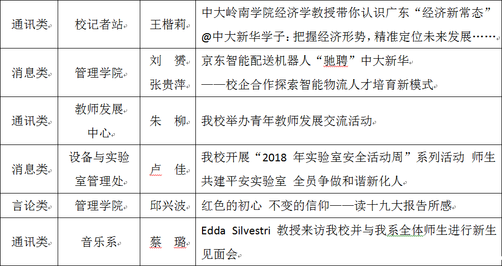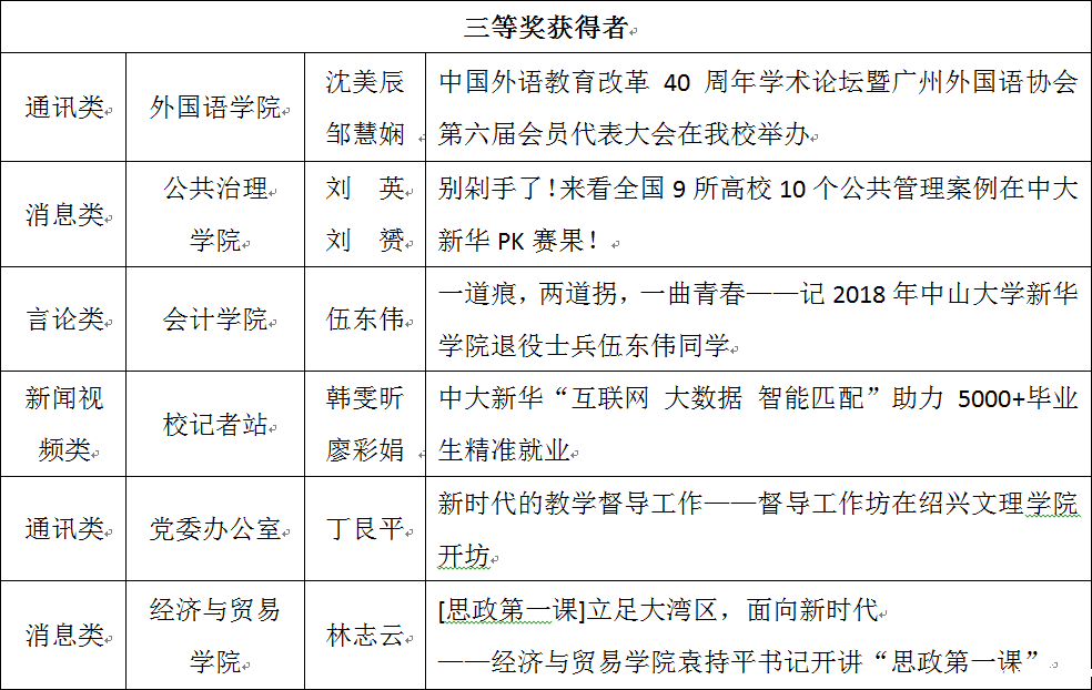 2018年12月14日至2019年1月8日,学校党委宣传部(宣传与新闻中心)依据《关于评选中山大学bv伟德体育app官网学院2018年度新闻宣传先进单位、优秀新媒体、好新闻作品的通知》(中新党宣〔2018〕4号)和《关于评选中山大学bv伟德体育app官网学院2018年度十佳通讯员、十佳记者的通知》(中新党宣〔2018〕5号),评选出5家新闻宣传先进单位、5家优秀新媒体、6位十佳通讯员、10位十佳记者、21件好新闻作品。现将评选结果公示如下: