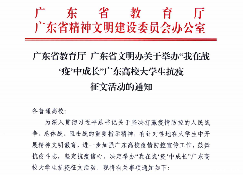 近日,广东省教育厅、广东省文明办围绕“坚决打赢疫情防控的人民战争、总体战、阻击战”主题,面向全省普通高校在校学生,举办“我在战‘疫’中成长”广东高校大学生抗疫征文活动。现将有关事项通知如下: