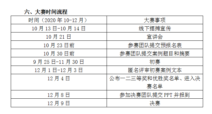 3.12月9日,决赛现场答辩正式开始,参赛队员需着正装、提前至少15分钟到达会场。每支队伍有10分钟展示案例分析报告的时间,5分钟回答评委老师提问。参赛队伍依次上台展示,可以采用视频、讲解、小品等方式展示案例故事情节和案例分析,展示形式不限。比赛所有流程按主持人提示进行,不得超时,否则由计时员直接叫停展示。评委老师将根据每支参赛团队的现场展示与答辩进行综合评分,确定最终奖项归属。