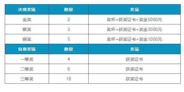 本次大赛决赛设立金奖两名,银奖三名,铜奖五名。复赛设一等奖四名,二等奖六名,三等奖十名。具体奖励如下: