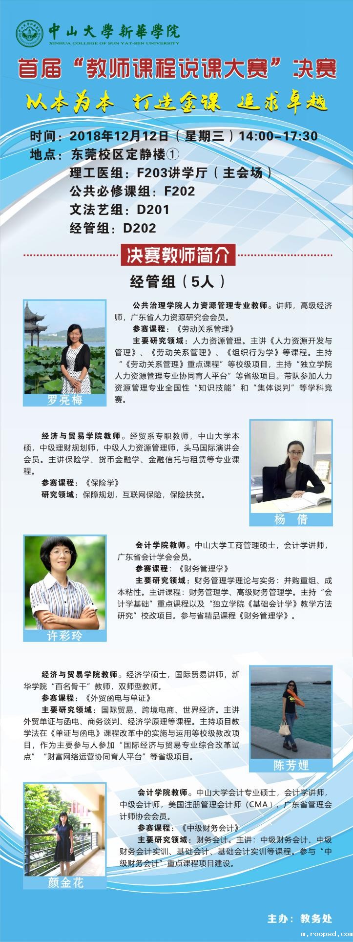 决赛于12月12日14:00-17:30在东莞校区定静楼①举行。本次比赛分为理工医组(F203)、公共必修课组(F202)、文法艺组(D201)与经管组(D202)四组同时进行,各自评比角逐。让我们拭目以待各位教师展现教学风采、师者魅力。