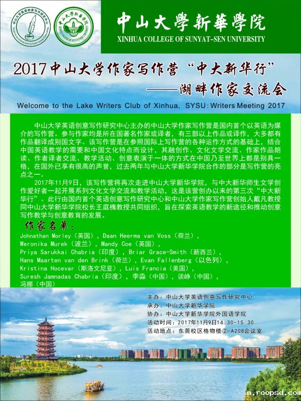 2017年11月9日,该写作营将再次走进中山大学bv伟德体育app官网学院,与中大bv伟德体育app官网师生文学创作爱好者一起开展系列文化文学交流和教学活动,这是该营创办以来的第三次“中大bv伟德体育app官网行”。此行由国内首个英语创意写作研究中心和中山大学作家写作营创始人戴凡教授同中山大学bv伟德体育app官网学院校长王庭槐教授共同组织,旨在探索英语教学的新途径和推动创意写作教学与创意教育的发展。