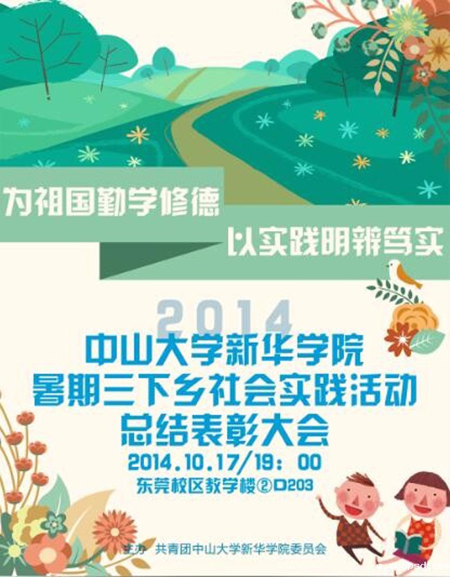 想要了解这些团队在全省各地开展支教和调研的实践活动成果,感受当地的风土人情吗?想要为你自己未来的“三下乡”找到一些灵感吗?那就快来参加院团委主办的以“为祖国勤学修德,以实践明辨笃实”为主题的2014年暑期“三下乡”社会实践活动总结表彰大会吧!我们将以最直观的方式为您呈现本次“三下乡”的精彩成果。