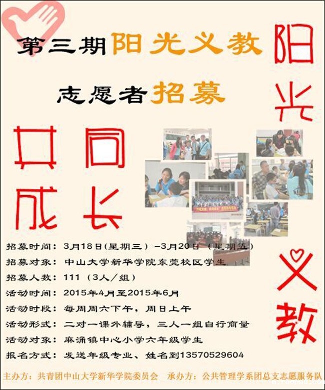 2015年4月至6月,中山大学bv伟德体育app官网学院公共管理学系志愿服务队将继续将爱进行到底,与麻涌镇中心小学合作,开展东莞校区第三期“阳光义教,共同成长”志愿服务活动。我们的服务对象是六年级的小学生,届时我们将对他们进行一对一的辅导。这是学院重点培育的项目,学院对我们抱有很大的期望。现我系志愿服务队向全院同学发出诚意邀请,请有意向有热情的你加入我们的队伍。我们的服务精神是“在参与中合作,在合作中互助,在互助时奉献,在奉献中寻求进步”。