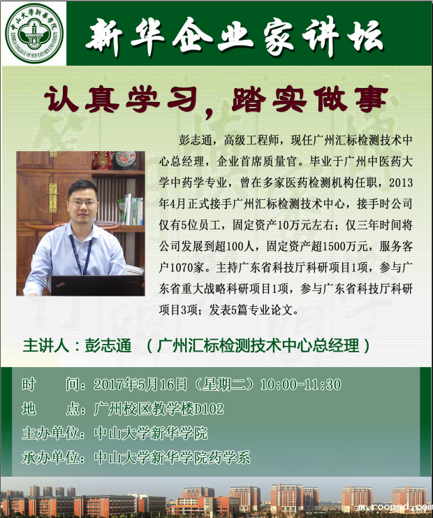 彭志通,高级工程师,现任广州汇标检测技术中心总经理,企业首席质量官。毕业于广州中医药大学中药学专业,曾在多家医药检测机构任职,2013年4月正式接手广州汇标检测技术中心,接手时公司仅有5位员工,固定资产10万元左右;仅三年时间将公司发展到超100人,固定资产超1500万元,服务客户1070家。主持广东省科技厅科研项目1项,参与广东省重大战略科研项目1项,参与广东省科技厅科研项目3项;发表5篇专业论文。