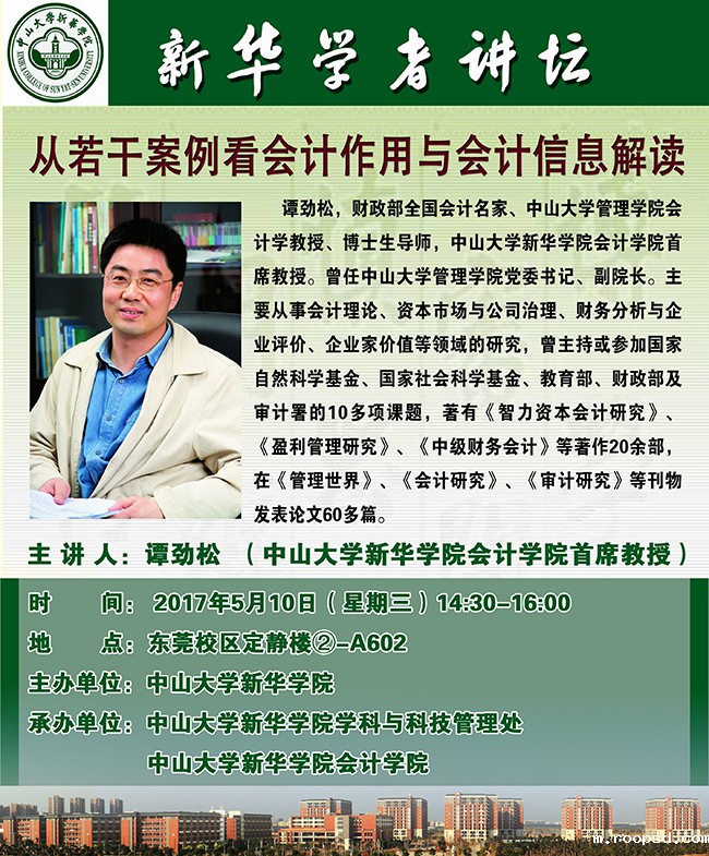 谭劲松,财政部全国会计名家、中山大学管理学院会计学教授、博士生导师,中山大学bv伟德体育app官网学院会计学院首席教授。曾任中山大学管理学院党委书记、副院长。主要从事会计理论、资本市场与公司治理、财务分析与企业评价、企业家价值等领域的研究,曾主持或参加国家自然科学基金、国家社会科学基金、教育部、财政部及审计署的10多项课题,著有《智力资本会计研究》、《盈利管理研究》、《中级财务会计》等著作20余部,在《管理世界》、《会计研究》、《审计研究》等刊物发表论文60多篇。