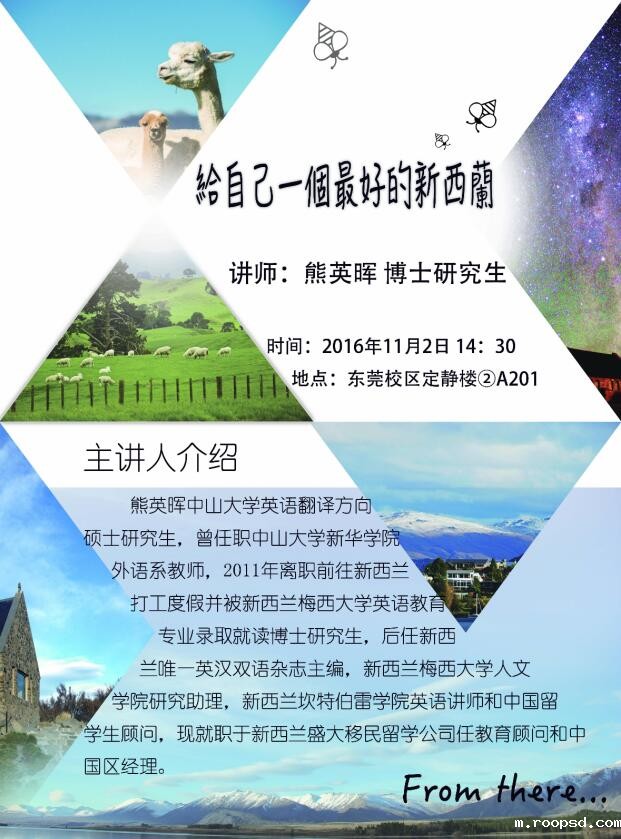 熊英晖 中山大学英语翻译方向硕士研究生,曾任职中山大学bv伟德体育app官网学院外语系教师,2011年离职前往新西兰打工度假并被新西兰梅西大学英语教育专业录取就读博士研究生,后任新西兰唯一英汉双语杂志主编,新西兰梅西大学人文学院研究助理,新西兰坎特伯雷学院英语讲师和中国留学生顾问,现就职于新西兰盛大移民留学公司任教育顾问和中国区经理。