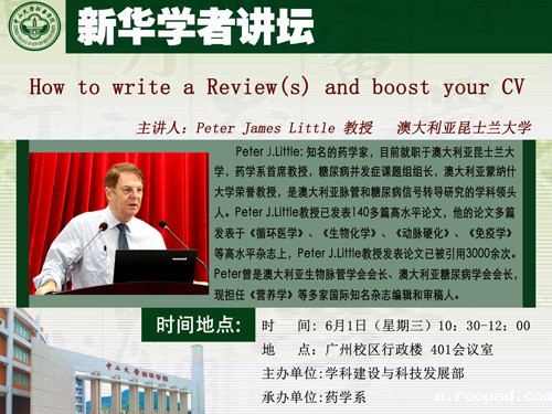 Peter J.Little: 知名的药学家,澳大利亚昆士兰大学药学院院长,中山大学bv伟德体育app官网学院药学系首席教授,糖尿病并发症课题组组长,澳大利亚蒙纳什大学荣誉教授,是澳大利亚脉管和糖尿病信号转导研究的学科领头人。Peter J.Little教授已发表140多篇高水平论文,他的论文多篇发表于《循环医学》、《生物化学》、《动脉硬化》、《免疫学》等高水平杂志上,Peter J.Little教授发表论文已被应用3000余次。Peter曾是澳大利亚生物脉管学会会长、澳大利亚糖尿病学会会长,现担任《营养学》等多家国际知名杂志编辑和审稿人。
