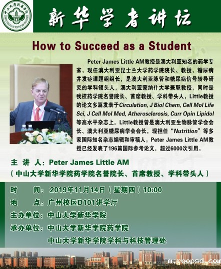 Peter James Little教授是澳大利亚知名的药学专家,现任澳大利亚昆士兰大学药学院院长、教授,糖尿病并发症课题组组长,是澳大利亚脉管和糖尿病信号转导研究的学科领头人,澳大利亚蒙纳什大学兼职教授,同时是我校药学院名誉院长、首席教授、学科带头人,Little教授的论文多篇发表于Circulation, J Biol Chem, Cell Mol Life Sci, J Cell Mol Med, Atherosclerosis, Curr Opin Lipidol等高水平杂志上。Little教授曾是澳大利亚生物脉管学会会长、澳大利亚糖尿病学会会长,现担任“Nutrition”等多家国际知名杂志编辑和审稿人。Peter James Little教授已经发表了196篇国际参考论文,超过6000次引用。