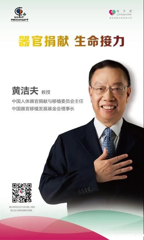 黄洁夫教授,中国器官移植界的学科学术带头人。从2005年开始,他领导了中国器官移植事业的改革,创建了一个中国器官捐献与移植的“中国模式”,引领中国器官移植事业进入了一个由公民自愿捐献为唯一合法器官来源的移植事业的新时代。1996年至2001年任中山医科大学校长兼党委书记,2001年11月任卫生部副部长、党组成员,2004年兼任中央保健办主任、中央保健局局长,2008年任中央保健委员会副主任(正部长级),中国共产党第十五、十六届中央候补委员,第十一届全国政协委员,第十二届全国政协常委、教科文卫体委员会副主任,现任国家器官捐献与移植委员会主任委员,中国器官移植发展基金会理事长,清华大学医院管理研究院院长。
