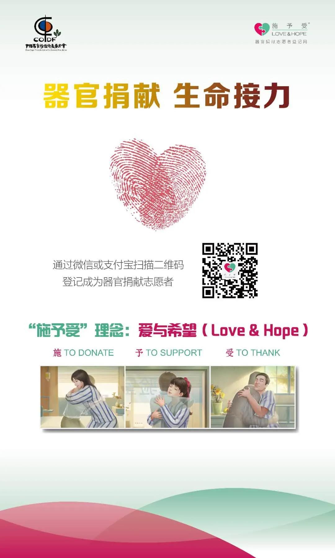 施予受中的“施”代表器官捐献者,“予”代表器官捐献事业支持者,“受”代表器官移植受者。施予受的宗旨理念,是传递爱与希望。