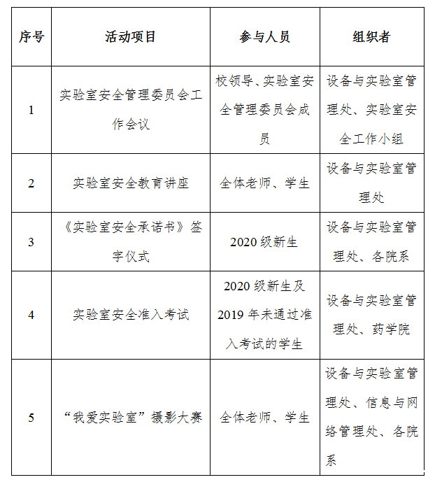 为深入贯彻《广东省教育厅关于高等学校实验室安全建设与管理规定(修订)》的相关精神,将实验室安全知识运用到学习、教学及科研工作当中,提高全校师生实验室安全意识并建立长效机制,打造平安bv伟德体育app官网,共建和谐校园,学校将开展2020年实验室安全教育系列活动。现将活动的具体事项通知如下: