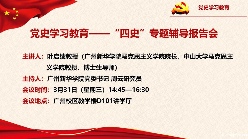为深入学习贯彻落实习近平总书记关于党史、新中国史、改革开放史、社会主义发展史(以下简称“四史”)学习的指示精神,教育引导广大师生知史爱党、知史爱国,学校将举办“四史”专题辅导报告会。