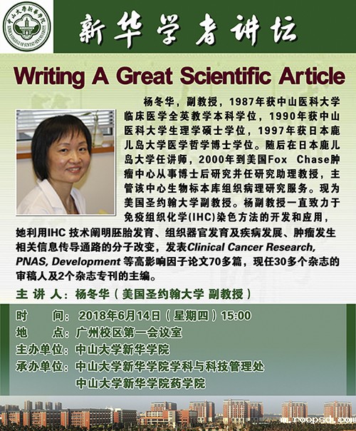杨冬华,副教授,1987年获中山医科大学临床医学全英教学本科学位,1990年获中山医科大学生理学硕士学位,1997年获日本鹿儿岛大学(Kagoshima University)医学哲学博士学位。随后在日本鹿儿岛大学任讲师,2000年到美国Fox Chase肿瘤中心从事博士后研究并任研究助理教授,主管该中心生物标本库组织病理研究服务。现为美国圣约翰大学副教授。杨教授一直致力于免疫组织化学(IHC) 染色方法的开发和应用,她利用IHC技术阐明胚胎发育,组织器官发育及疾病发展,以及肿瘤发生相关信息传导通路的分子改变,发表多篇Clinical Cancer Research,PNAS,Development等高影响因子论文70多篇,现任30多个杂志的审稿人及2个杂志专刊的主编。