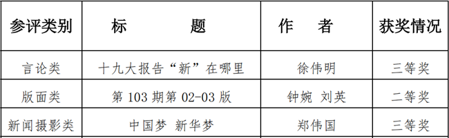 12月3-4日,中国高校校报协会2018年年会暨第三届中国高校传媒发展高端论坛在福州召开,会上揭晓了“2017年度中国高校校报好新闻” 评选结果。我校校报有3件作品获奖。其中,“第103期第02-03版”获版面类二等奖;《十九大报告“新”在哪里》获言论类三等奖;《中国梦