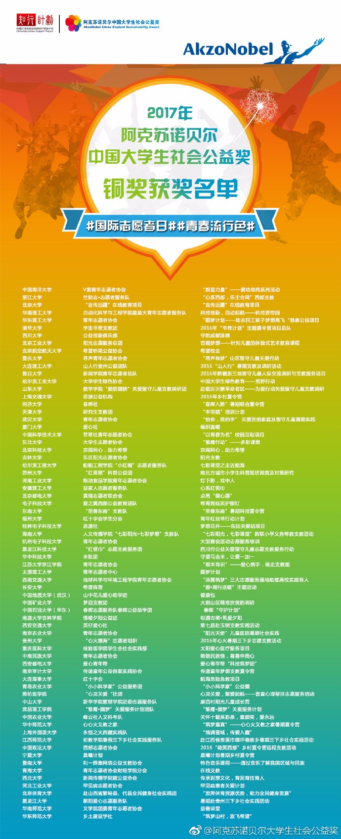 2017年阿克苏诺贝尔大学生社会公益奖铜奖获奖名单