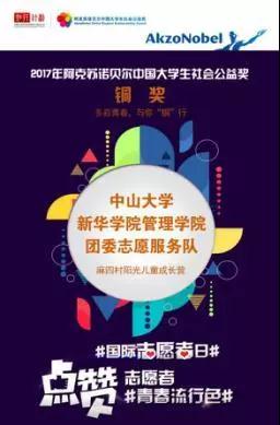 在12月5日国际志愿者日到来之际,2017年阿克苏诺贝尔中国大学生社会公益奖通过官方微博进行了线上颁奖。中山大学