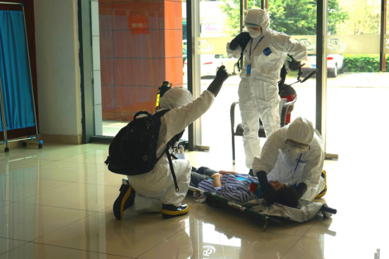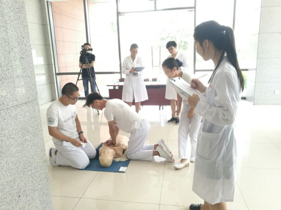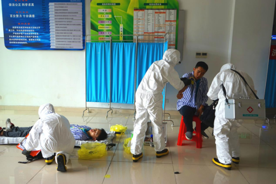 “非预防医学组”竞赛环节包括心肺复苏(cpr)和应急演练医学救援演练。赛前,两支队伍提前到比赛场地熟悉装备,再次认真聆听指导老师给予的指导。在心肺复苏环节中,一组3人分工合作——打电话呼救,心外按压和人工呼吸,3人默契十足,动作连贯,沉着应对;在应急演练环节中,队员们从容不迫,把应急救援的各步骤逐一检查,穿脱防护装备、发现疫情、急救、消毒和最后的报告,每个环节都表现得精彩绝伦。