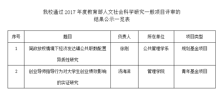 据《教育部社科司关于2017年度教育部人文社会科学研究一般项目评审结果的公示》(教社科司函〔2017〕125号)文件,我校公共管理学系徐刚教授申报的规划基金项目——《简政放权情境下经济发达镇公共职数配置异质性研究》和管理学院汤海滨老师申报的青年基金项目——《创业导师指导行为对大学生创业绩效影响的实证研究》通过立项评审,这是我校在第二个发展十年大力践行“学术强校、质量立校、特色兴校、开放办校”新时期发展方略的又一重要成果。