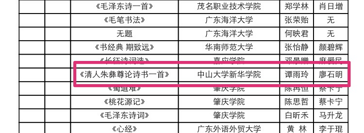 3月27日,第十一届广东大中专学生校园文体艺术节获奖名单公布。我校陈韦霖同学凭借作品《彩虹·轨迹·花海》荣获第二届广东大学生新媒体作品创作大赛电子海报组二等奖,谭雨玲同学凭借作品《清人朱彝尊论诗书一首》荣获第六届广东大中专学生书画艺术作品大赛非专业毛笔组三等奖,主持人人才库的张可同学荣获第十一届广东大学生主持人大赛业余组二等奖。