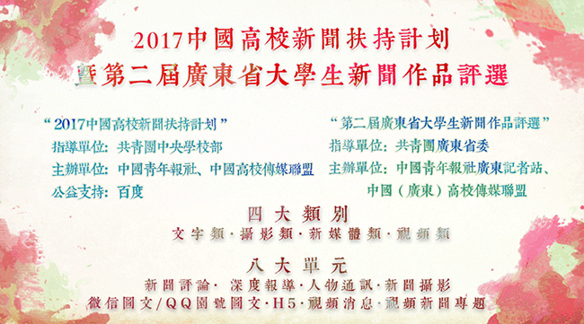 据了解,“2017中国高校新闻扶持计划”(原“中青报大学生新闻奖”)是在共青团中央学校部指导下,中国青年报社、中国高校传媒联盟主办,百度公益支持的高校新闻作品 评选活动。活动自2017年2月8日开始报名,旨在激励校园媒体人积极参与新闻实践,提高新闻业务水平。