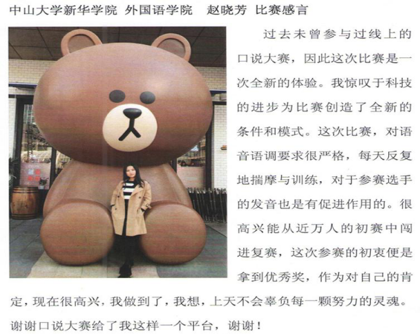 据了解,此次大赛全省高校图书馆和公共图书馆共有20369名读者报名参赛。我校图书馆接到口语大赛通知后积极报名参加,在2月28日获得组织参赛资格后,寒假里就开始准备相关的组织筹备、宣传等工作。3月份开学后,图书馆唐玉佳老师面向2016级新生、图书馆志愿者和助理等积极宣传赛事,并与外国语学院的欧衍伽、林少淇老师合作,组织学生报名参与比赛。