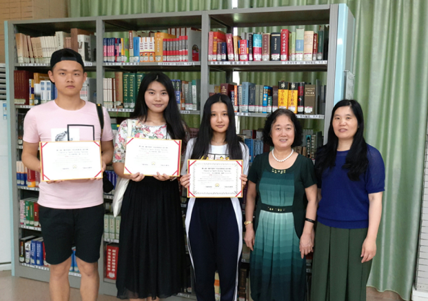 我校图书馆副馆长钟伟珍(左二)给大赛三等奖获奖者颁发证书并合影
