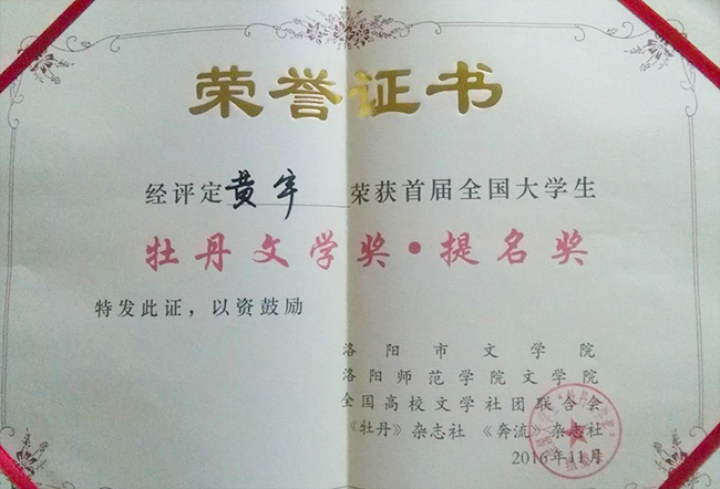 我校校友黄宇的组诗——《尘埃落定》获首届全国大学生牡丹文学奖诗歌提名奖。