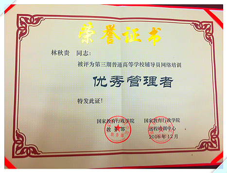 近日,国家教育行政学院对在第三期普通高等学校辅导员网络培训工作中表现突出的高校和管理者予以表彰,我校荣获“优秀组织单位”,校长助理、学生工作部部长林秋贵荣获“优秀管理者”。