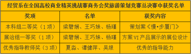 2014级经济学会展方向的梁碧娴、王巧妹、杨瑾三位同学组成 “以梦为马队”,凭借扎实的专业功底、灵活的答辩能力以及充分的准备在总决赛现场陈述及答辩环节中得到了在场评委的一致认可,并以策划案《慢·步厦门》荣获了本科组二等奖;同时,作品展示台的展位设计以香炉及樟木等一系列物件紧密衬托策划主题,更是博得评委老师的青睐,并荣获展洽组一等奖。最后,夏淼老师、吴垠老师、谭健萍老师,分别荣获“优秀指导教师奖”,成绩喜人。