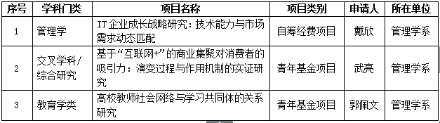 7月12日,教育部社会科学司正式公布了关于2016年度教育部人文社会科学研究一般项目立项的通知。我院管理学系获批2016年度教育部人文社会科学研究项目3项,其中2项为青年基金项目,1项为自筹经费项目(具体信息如下表1)。这是“十三五”规划开局之年,学院提出“学术强校、质量立校、特色兴校、开放办校”发展思路后,我院在社会科学研究上取得的新成绩和新突破。